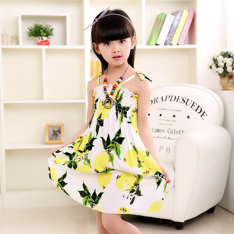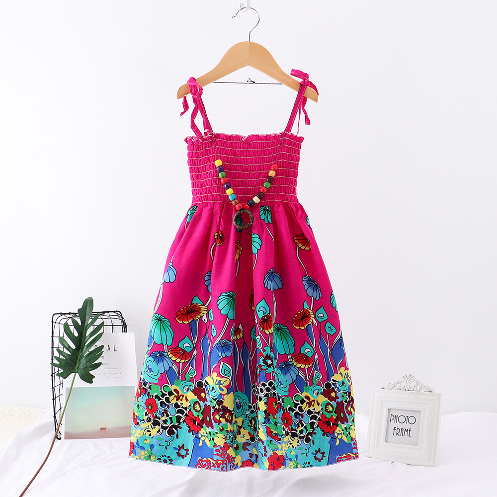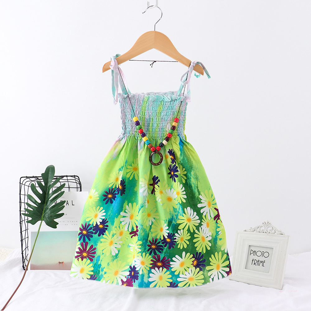 2-10Y Kid Girls Rainbow Flower Print Smocked Cami Dresses For Girls With Necklace
