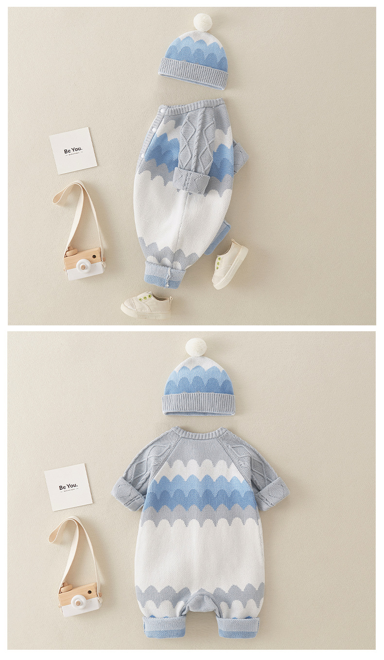 0-18M Baby Boys Contrast Knitting Jumpsuit & Hairball Hats Baby Clothing